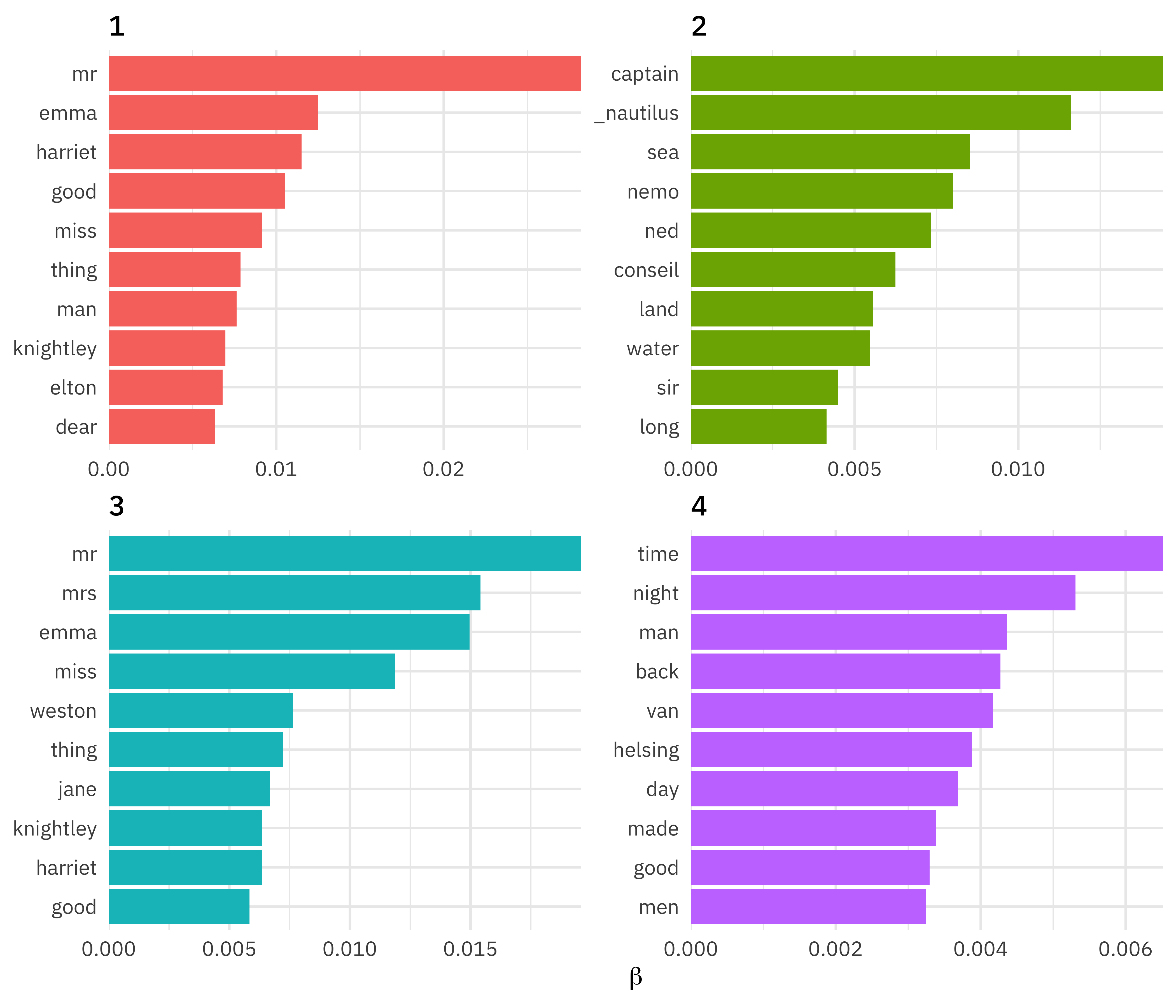 #> Score: helsing, martians, lucy, mina, van, jonathan, diarychapter_topics <- tidy(topic_model, matrix = "beta")