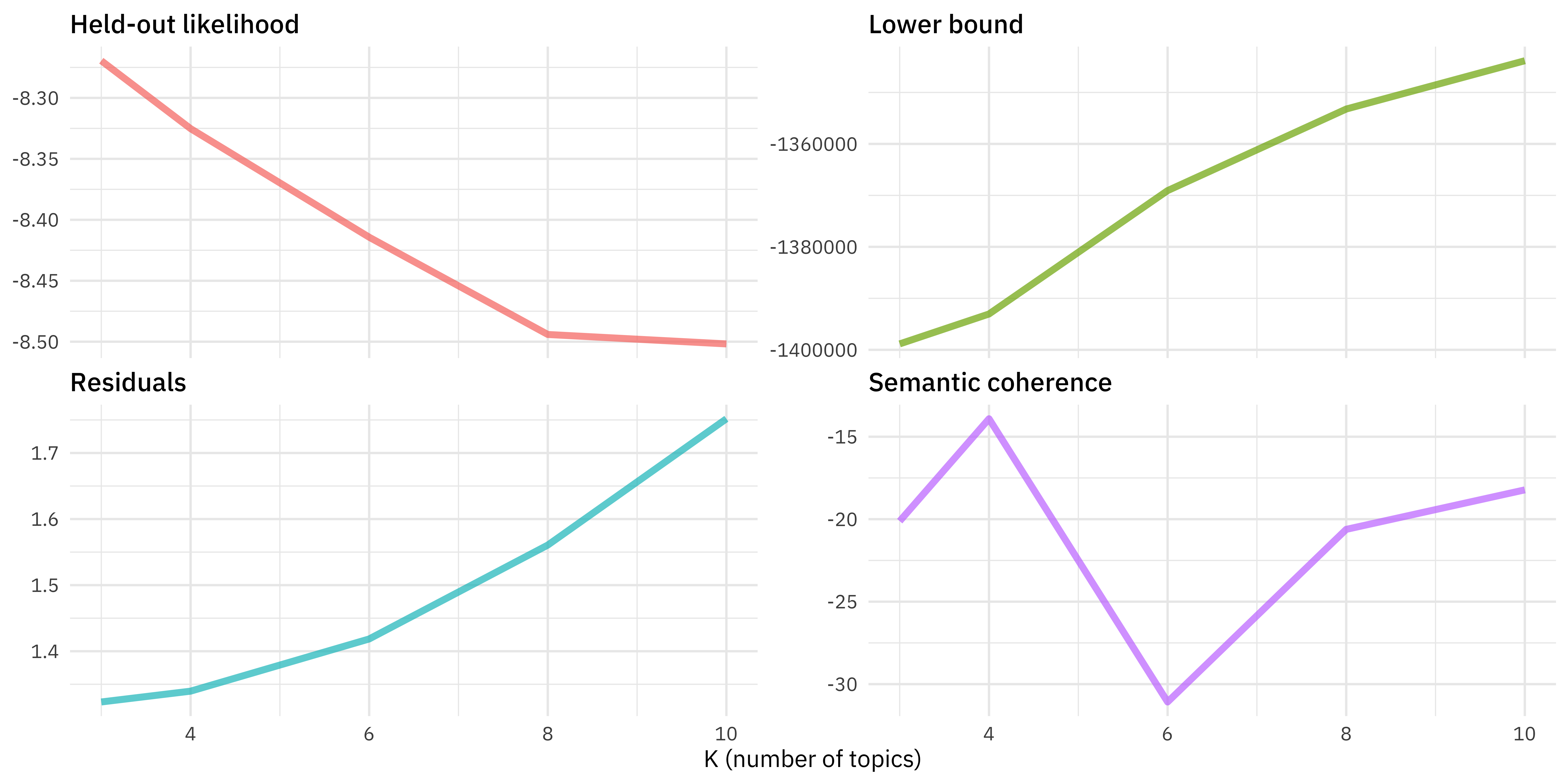 facet_wrap(~Metric, scales = "free_y")Semantic coherence is maximized when the most probable words in a given topic frequently co-occur together